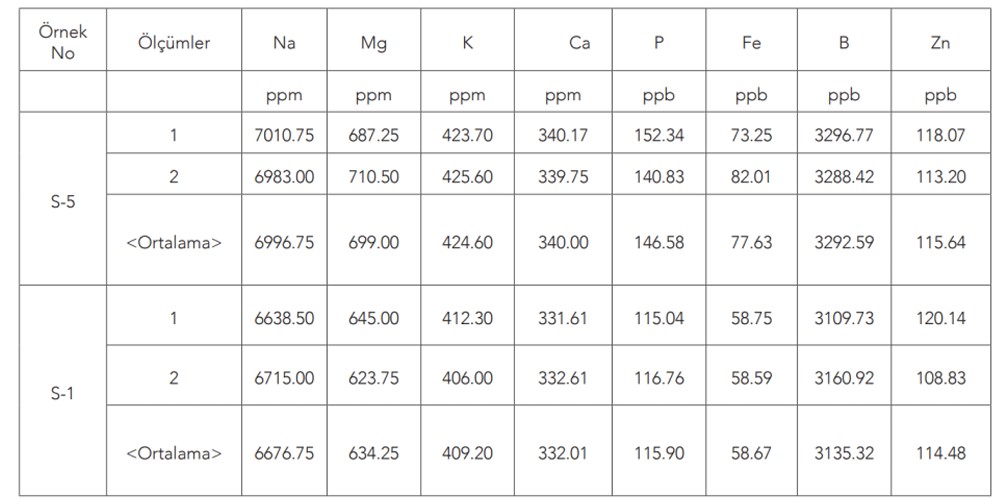 Tarımda kullanılan gübrelerde yüksek oranda azot (N) ve fosfor (P), yüzey veya yeraltı taşınımıyla denizlere ulaşmakta ve denizlerin pH değerini düşürerek elektrik iletkenliğini artırmaktadır. Deniz suyunun aniden ısınması, besin zincirindeki farklılaşma, canlı popülasyonunun artması ve rekabet koşulları da müsilaj oluşumunun ana sebepleridir. Marmara Denizi’nin temiz bölgesinden alınan su numunesi (S-1) ile müsilajla kirlenmiş bölgeden alınan su örneğine (S-5) ICP-OES yöntemi ile element analizi yapılmış ve elementlerin konsantrasyon değerleri saptanmıştır. Ölçüm sonuçlarında bazı elementlerin (Mn, Zn, Al, Cu, As, Pb, Cd, Hg, Mo, Co, Cr, Sb, Bi, Ni) ölçüm değerleri ölçüm sınırının altındadır. Ölçüm sonuçlarına göre bazı elementlerin (K, P, Ca, Mg, B, Fe, Zn) konsantrasyonları ise normal değerlerin üzerinde olduğu anlaşılmaktadır.